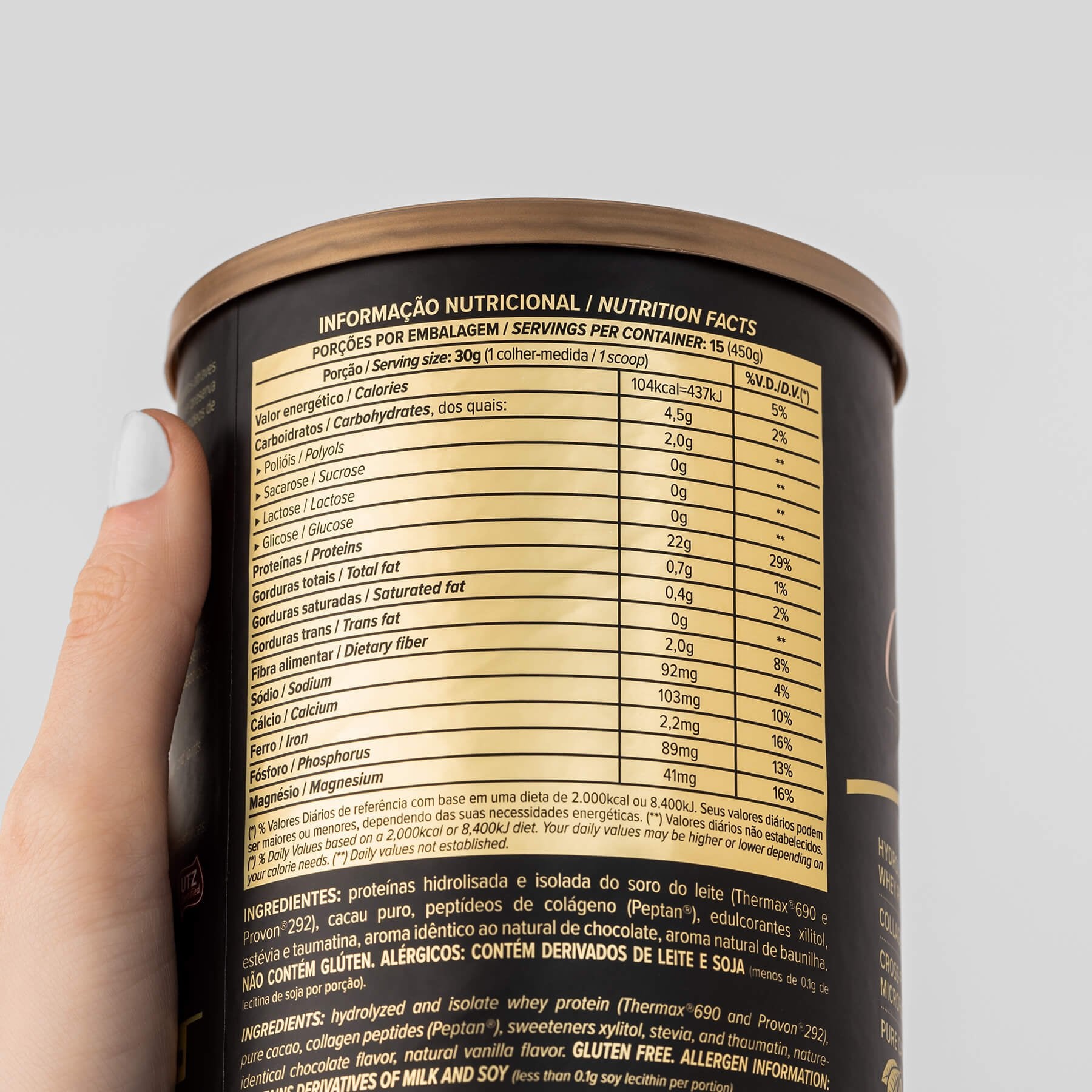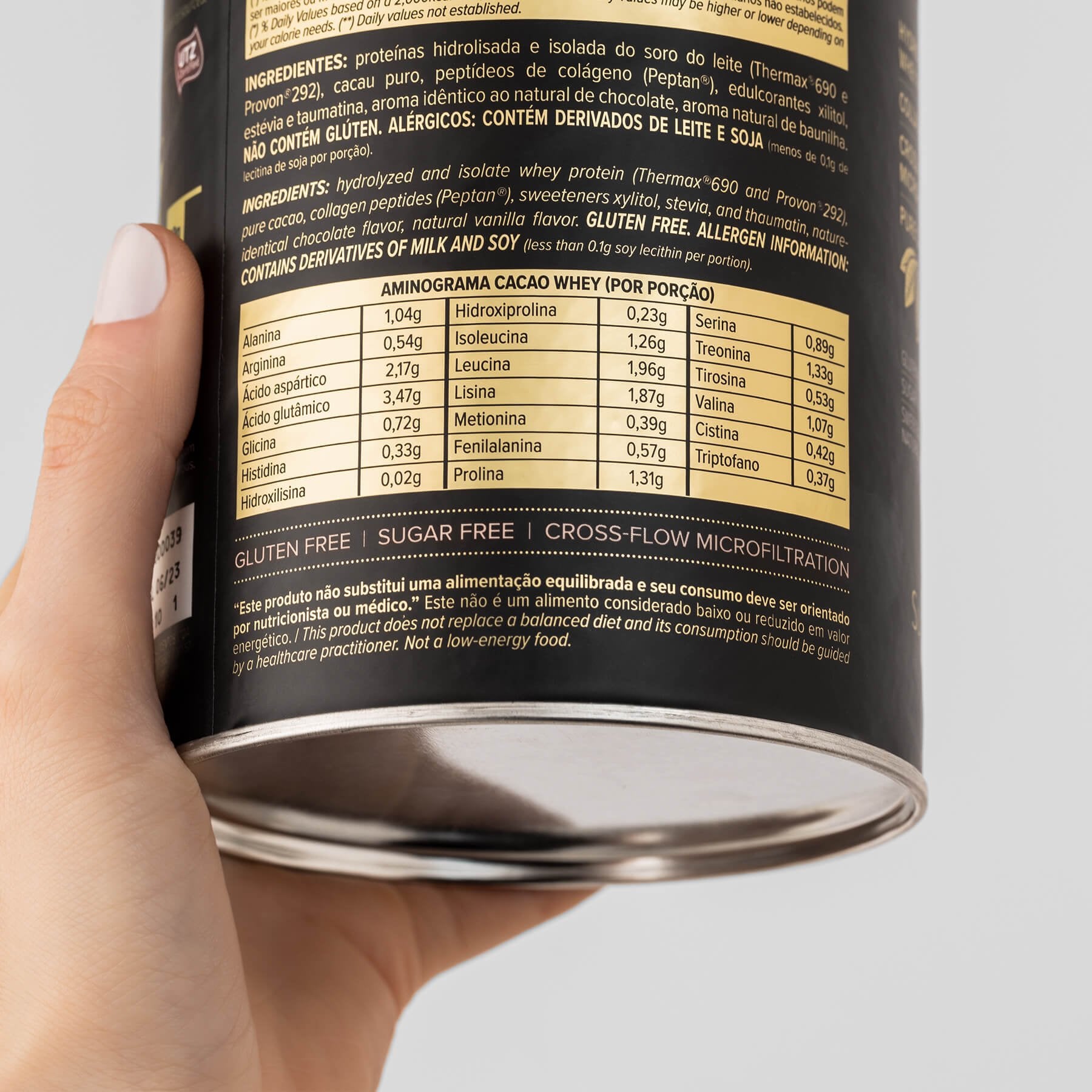 Cacao Whey é um delicioso blend de Whey Protein Hidrolisado e Isolado, Cacau Gourmet e Peptídeos de Colágeno hidrolisado, que agregam valor à fórmula e complementam a ação das proteínas.
